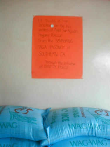 Samahang Hagonoy,USA thru Ex-President Tanny Fajardo-(San Miguel) processed the distribution of fourteen (14) cavans of rice to all 14-families who are victims of the Balut-San Agustin fire of April 2006. Recipients had expressed gratitude to the organization thru him.